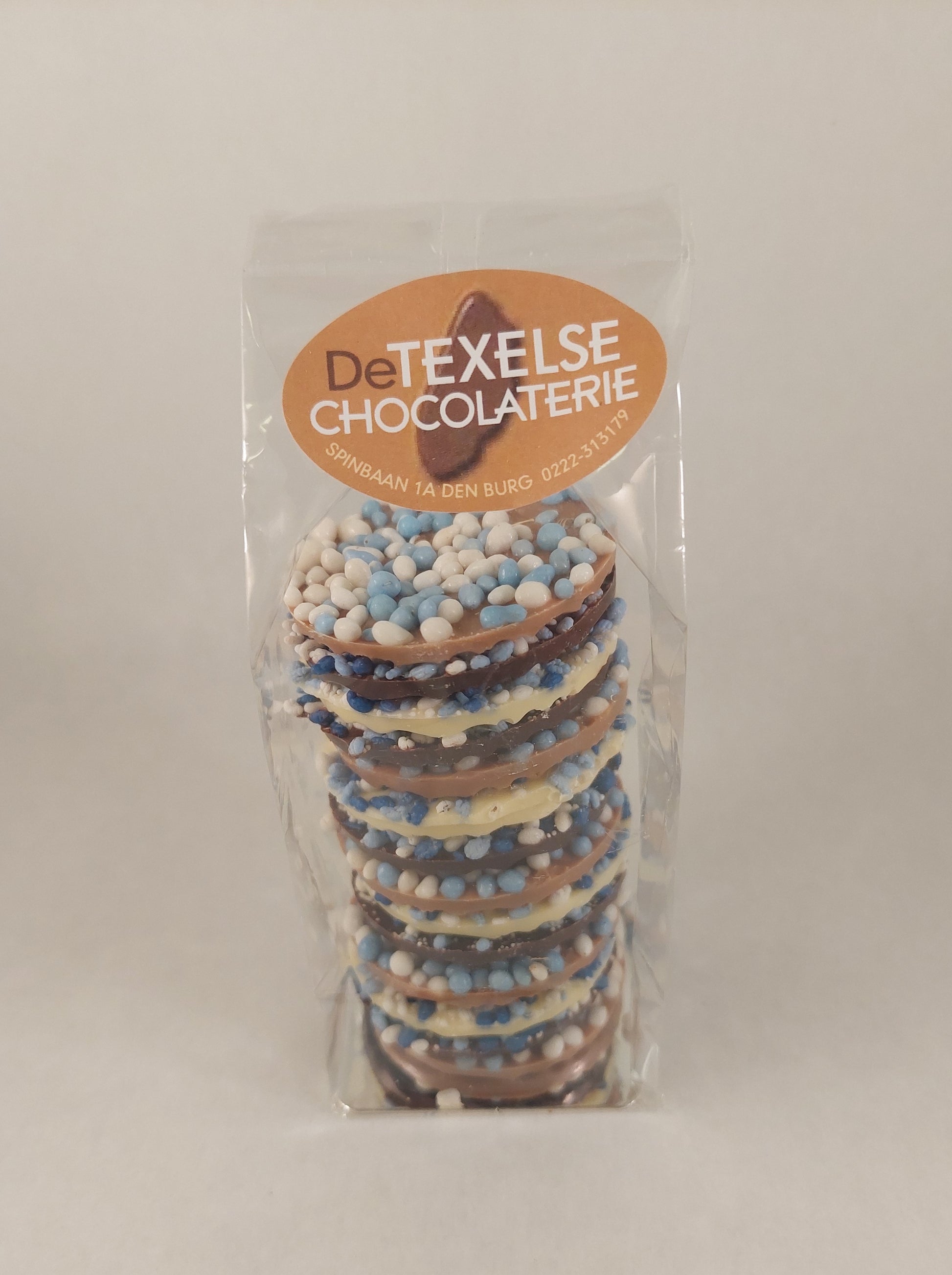 Geboorte flikjes melk, wit en pure chocolade bestrooid met blauwe muisjes.