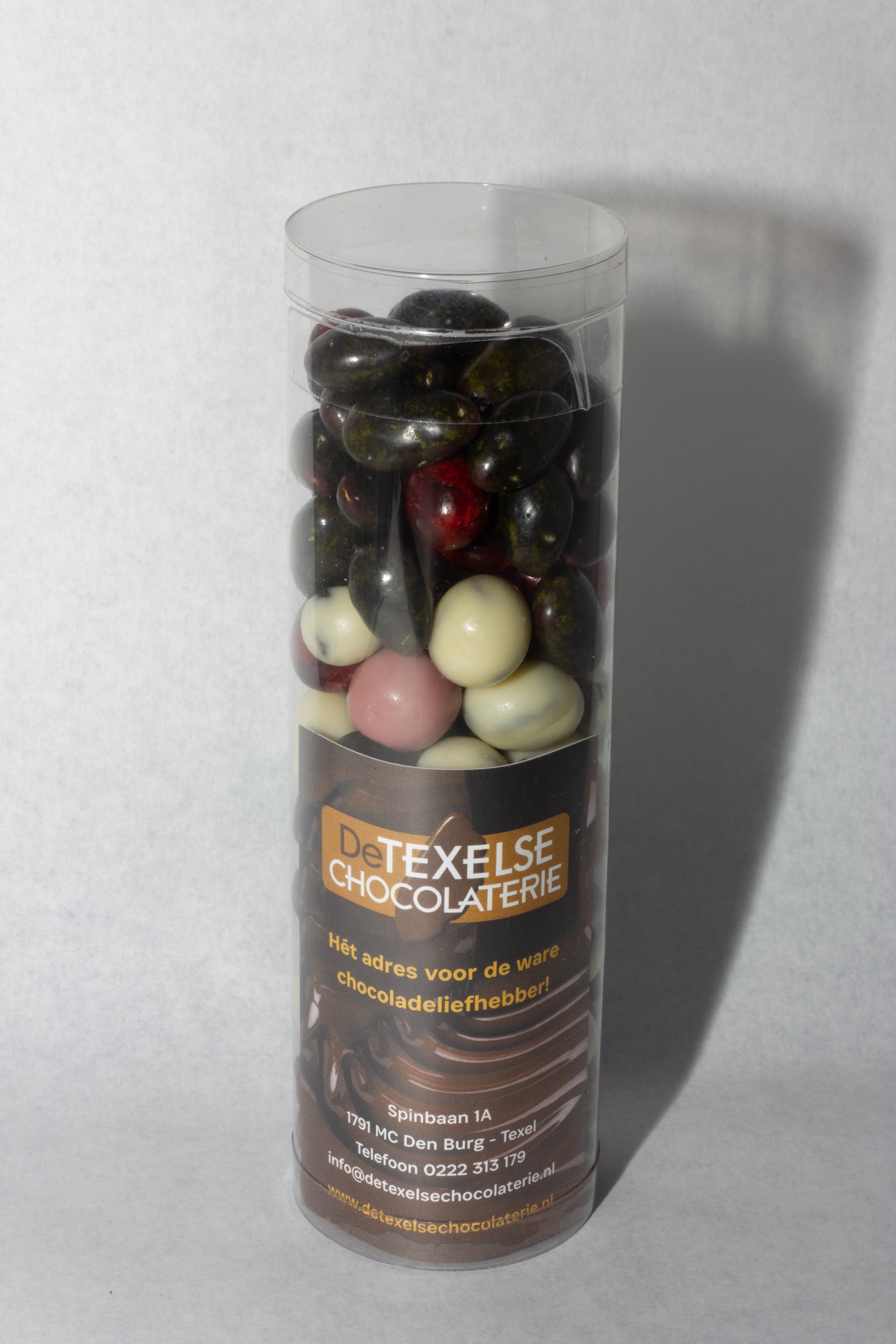 Diverse noten en vruchten gehuld in een dun laagje chocolade.